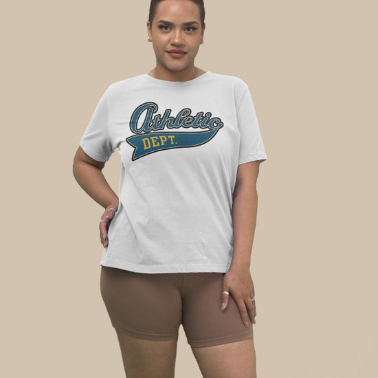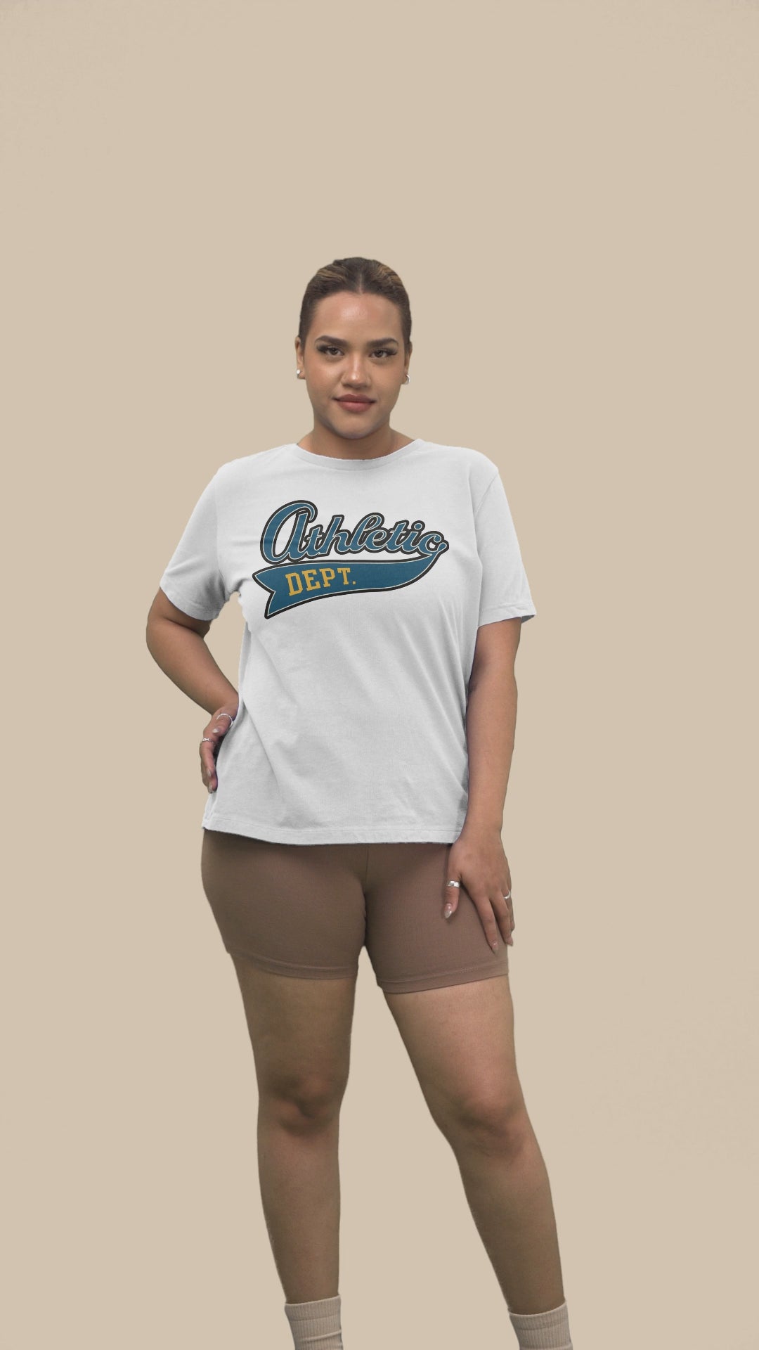 Show off your sporty style with our "Athletic Dept." tee! This crisp white t-shirt features a retro-inspired graphic with "Athletic" arched above and "Dept." below, enclosed within a blue banner with gold trim. It's a classic design with a vintage athletic vibe.