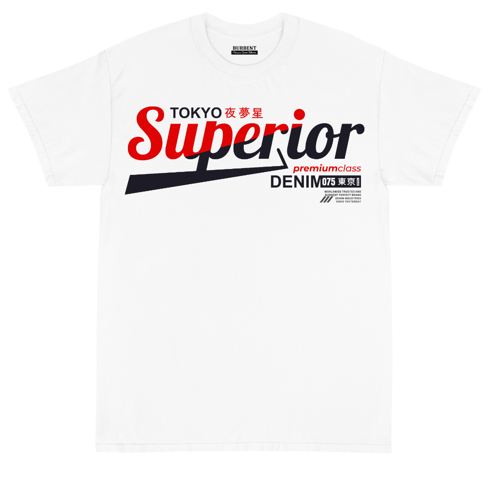 Crafted from 240 GSM stretchable pure cotton, this tee feels dense, luxurious, and extremely comfortable. The crisp White base creates a clean canvas for the bold red, black, and grey “Superior / Tokyo Premium Class Denim 075” graphic, giving it a sleek international street-style look.